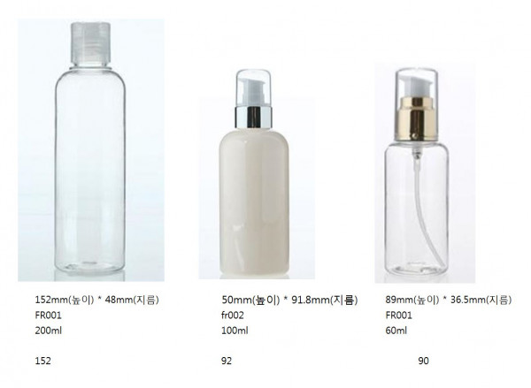 2.에센스 FR002/ 100ml / 50mm(높이) * 91.8mm(지름) 3.에센스 FR001/ 60ml / 89mm(높이) * 36.5mm(지름) 를 추천드립니다. 그리고 cs-037 50ml, 180ml 의 경우 스킨 로션 , 에센스로 가장 잘나가는 형태 입니다 귀사의 제품의 경우 용량이 좀 맞지 않으나 일반적으로 고객님들 께서 많이 선호 하기에 의견드립니다 타사 제품중에서 나간 이미지 첨부합니다 고객님께서 보신 fcy-027 상품의 경우 용기의 네크가 스넵온 타입으로 한번 잠긴후 열리지 않은 형태인점 체크하여 주십시오 용기 형태가 예뻐서 일부 고객님들께서 많이 사용하시는 타입입니다 용량은 90, 115, 145 용량이 있습니다 감사합니다
